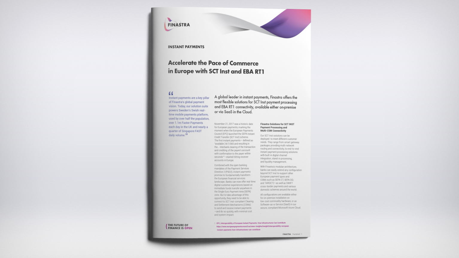 This factsheet describes how banks in Europe can take advantage of immediate payments transfer anywhere in the Single Euro Payment Area (SEPA) zone arising from the SEPA Instant Credit Transfer (SCT Inst) scheme and the open banking mandate of the Payment Services Directive 2 (PSD2). It also articulates the numerous benefits banks will achieve from adopting production-proven payments technology.