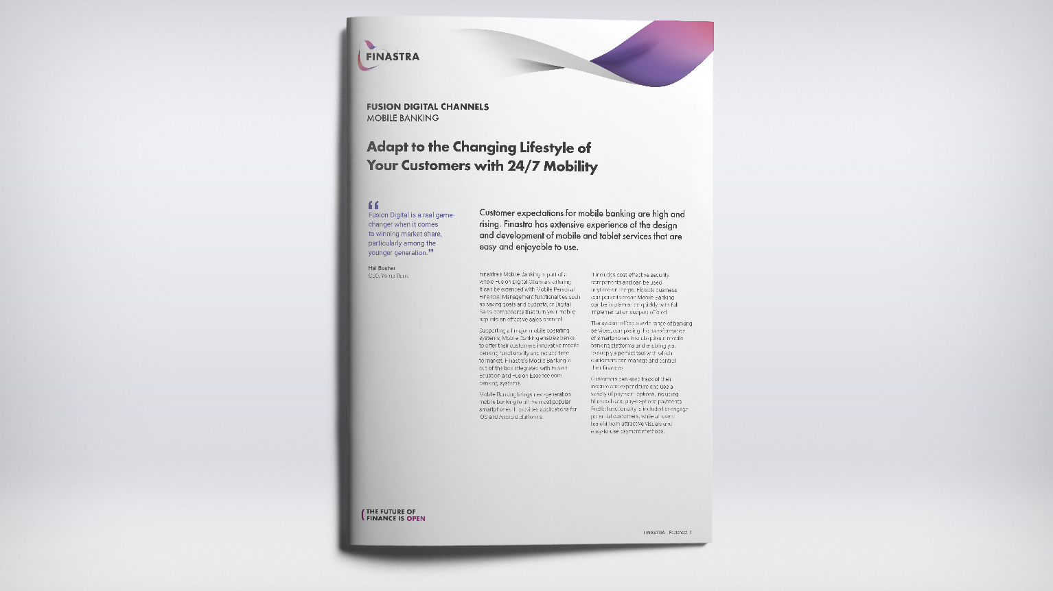 Customer expectations for mobile and tablet banking are high and rising. Finastra has extensive experience of the design and development of mobile and tablet services that are easy and enjoyable to use.