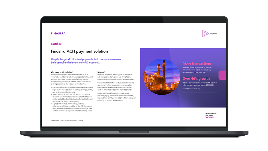 Implementation of Finastra’s modern payment hub solution, Global PAYplus, guarantees not only ongoing support for your ACH processing (including compliance with NACHA changes) but the opportunity to transform other rails in line with your business and operational objectives. With Global PAYplus, financial institutions can modernize their payments architecture including supporting growing ACH payments.