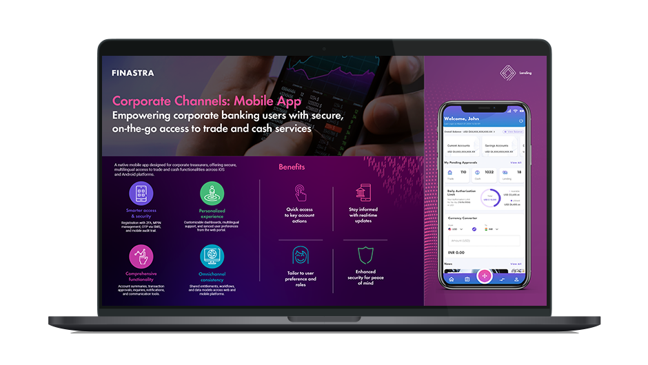 Finastra Corporate Channels native mobile app designed for corporate treasurers, offering secure, multilingual access to trade and cash functionalities across iOS and Android platforms.