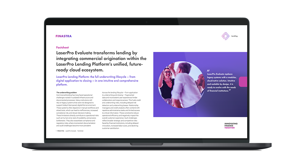 LaserPro Evaluate transforms lending by integrating commercial origination within the LaserPro Lending Platform’s unified, future-ready cloud ecosystem.