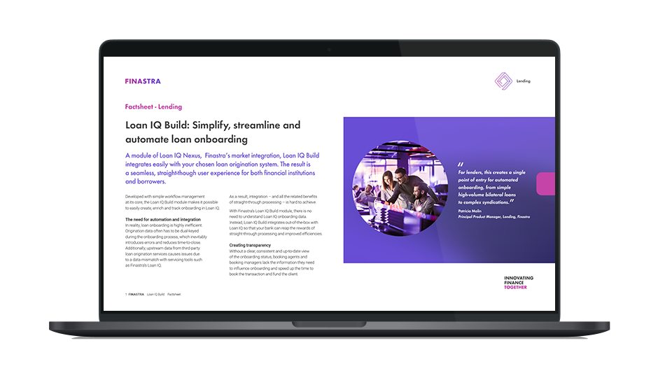Loan IQ Build streamlines loan onboarding by unifying fragmented lending processes and standardizing workflows across products and lines of business. Built around simple workflow management, it enables lenders to create, enrich, and track onboarding seamlessly within Loan IQ through a single point of entry. The result is a transparent, efficient, and automated onboarding experience for everything from high‑volume bilateral loans to complex syndications.