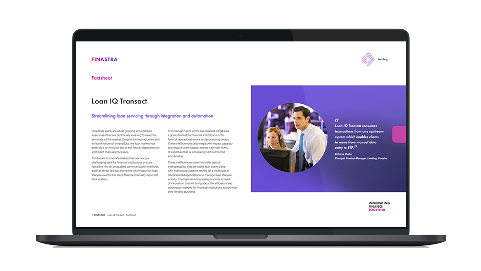 Loan IQ Transact eliminates the need for users to manually key loan lifecycle event details into the system by allowing clients to ingest transactions/lifecycle events from any upstream system into Loan IQ, automating the entire process. Loan IQ Transact allows clients to easily connect to external generic API’s while Finastra manages the translation and integration to LIQ, lowering costs while also providing the efficiency required to scale the business.