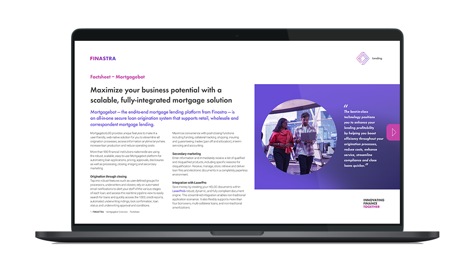 More than 900 financial institutions nationwide are using the robust, scalable, easy-to-use Mortgagebot platform for automating loan applications, pricing, approvals, disclosures as well as processing, closing, imaging and secondary marketing.