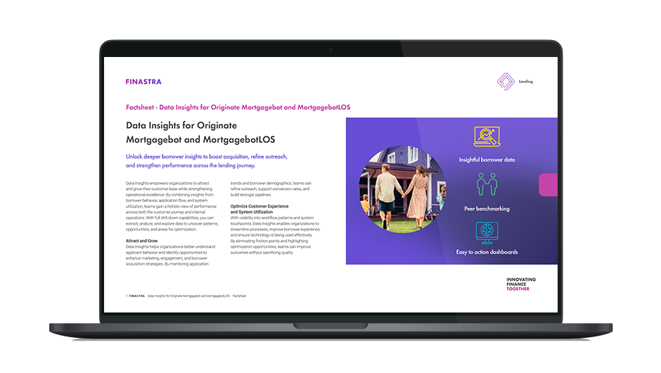 Finastra Originate Mortgagebot Data Insights brings consumer behavior and demographics for your institution alongside more than 1,600 Finastra Originate Mortgagebot users. With powerful insight, you can build lending, deposits and marketing strategies that lead to a stronger, revenue generating portfolio.