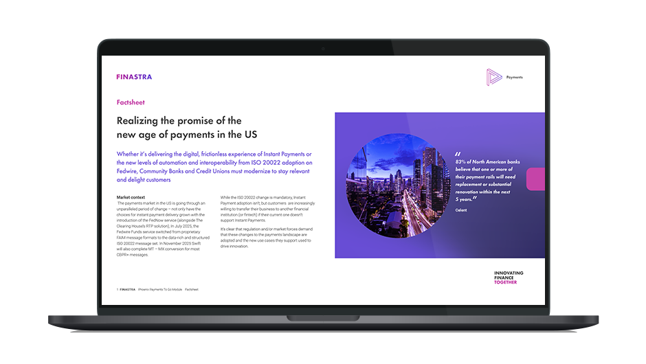 Finastra is providing a pre-integrated solution combining Fusion Digital (for payment initiation and tracking), Finastra Payments To Go (our Payments-as-a-Service (PaaS) hub), Fusion Phoenix (for Core banking), and our partner fintech ecosystem for additional services (such as compliance, AML, and fraud management) specifically suited to US mid-market financial institutions, such as Community Banks and Credit Unions.