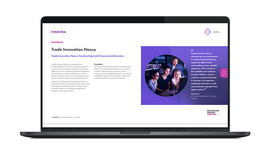 - Streamlined integration: Unified API layer connects Finastra’s Trade Innovation platform with core banking systems and third-party applications.