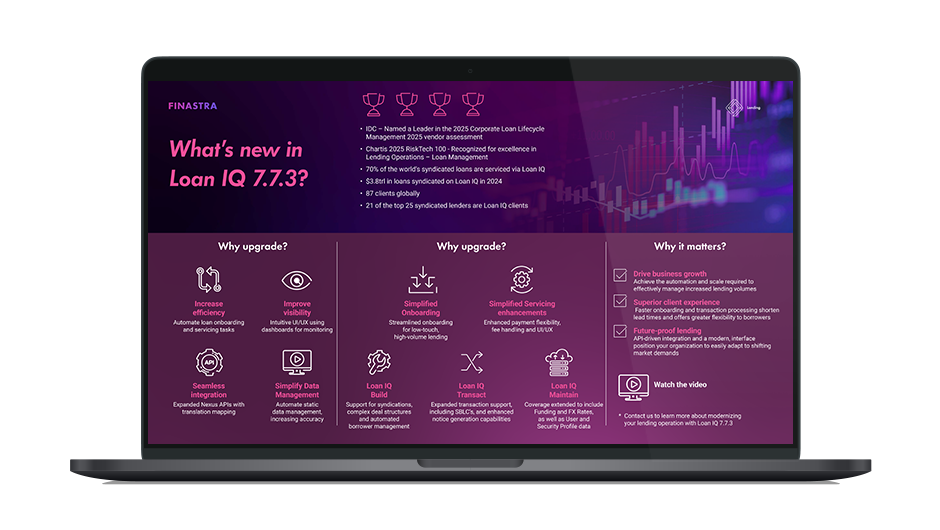Learn more about how upgrading to Loan IQ 7.7.3 empowers your lending operations by providing greater efficiency, scalability, and an improved client experience. The latest release builds introduces additional automation for loan onboarding and servicing, reducing manual effort and offering scale to grow your lending business. With expanded capabilities for syndications, complex deal structures, and data management, Loan IQ 7.7.3 positions your business to handle higher volumes seamlessly and drive growth. An intuitive dashboard-driven UI improves visibility and control, while API-driven integration ensures your organization is future-ready and adaptable to market changes.