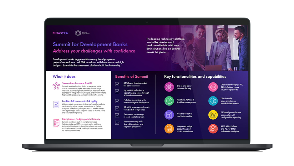 Managing multi-currency bond programs, project finance, and ESG commitments under resource constraints is complex. Summit simplifies this reality with a cross-asset solution designed for development banks. This overview highlights how Summit’s integrated capabilities streamline operations, enhance transparency, and support strategic decision-making across funding and investment activities.